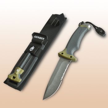 Das Gerber Ultimate Knife verfügt über eine halb gezackte Drop-Point-Klinge, einen strukturierten Gummigriff, einem Stahlhammerknauf und eine Notfallpfeife. Die haltbare Hülle hat einen Anspitzer und einen Feuerstarter. Sein kräftiges, glasfaserverstärktes Nylonheft liegt dank der weichen und trotzdem griffigen Beschichtung angenehm und sicher in der Hand. In der Scheide ist zudem ein Schärfsystem eingebaut.